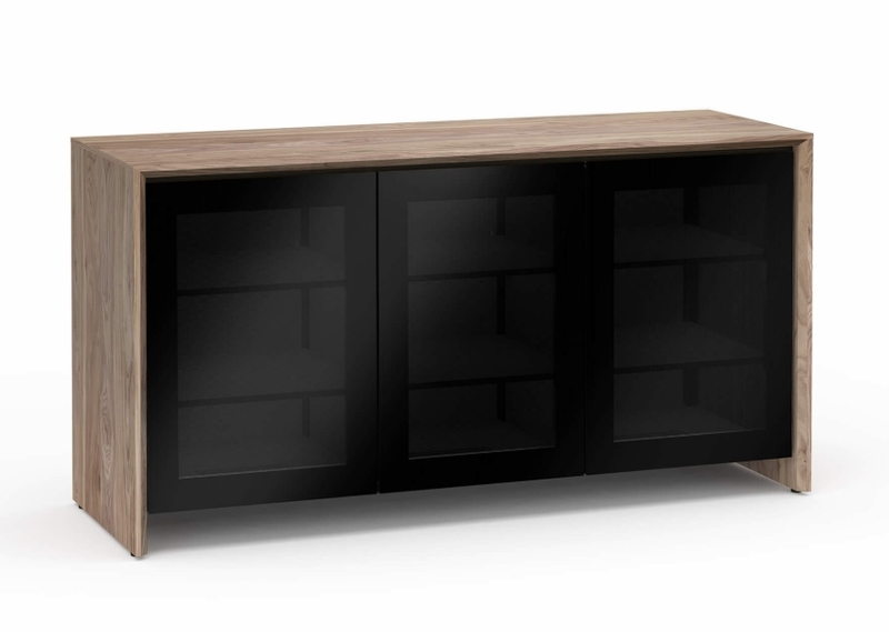 Clean, cutting-edge design with beveled edges and precision miter joints is highlighted by a walnut finish, and by aluminum framed, and smoked black glass doors.