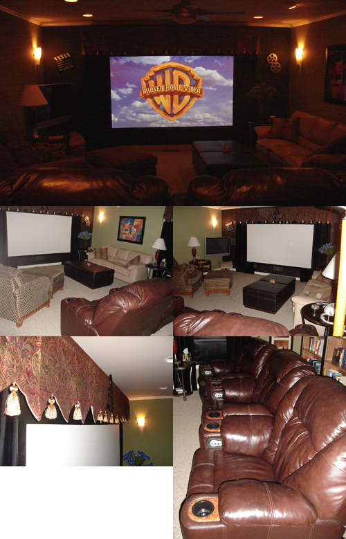 Description: This theater was built on a tight budget. The speakers were bought from JBL off Ebay (JBL HT in-wall speakers) and they sound fantastic! The Onkyo subwoofer is one I have had for several years and it rocks the house! The 5.1 JVC RX-9000V receiver gives the inputs, power and flexibility to allow the selection of satellite, HD Antenna, Cable and DVD seamlessly. DVDs run from two players: the Toshiba SD-2109 (for the open video) and the Panasonic DMR-E85H recorder/player for the movie. The Open video runs through the Panasonic to create a seamless look from one video to the other. The projector is an Infocus IN72 and although it is not HD, High Definition looks unbelievably sharp. The screen is a power tensioned 106" Elite that I bought at a fraction of the cost of the Dalite. Power shades by Draper cover the windows behind the screen and at the side. The three theater chairs are leather Ashley power recliners and additional seating includes a leather sofa on one side and a chair with ottoman on the other. The wall behind the screen is painted black and the screen is flanked at the sides by black velour curtains and at the top by a maroon and gold decorative "theater like" valance. All equipment is in an adjacent room and controlled by the Harmony 890 RF remote. This remote also controls three tiers of Z-Wave lighting (front sconces, center and rear can lights). With the touch of a button, the screen and shades lower, the lighting dims, the "welcome" open starts and the movie begins. I will eventually replace the projector and DVD player with High Definition.