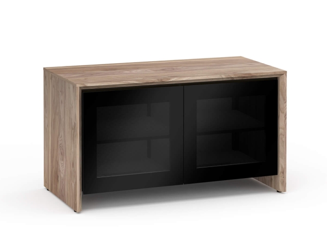 Clean cutting-edge design with beveled edges and precision miter joints is highlighted by a natural walnut wood finish and by aluminum framed and smoked Black glass doors.