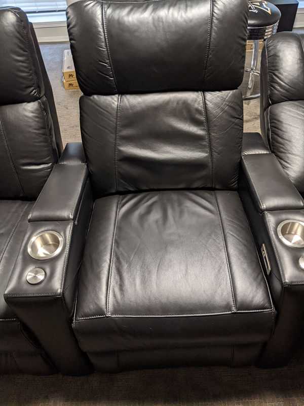 Close out configuration special only three sets are left at this price. No other coupons applicable. HT Design Addison Art Deco Home Theater Seating black top grain leather with unique design with High Back, In Arm Storage, Power Recline, USB Charging, Stainless Cupholders